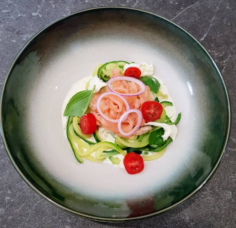 Dresser de courgettini, oversaus en leg hierop de gerookte zalm, de mozzarella en de kerstomaten.