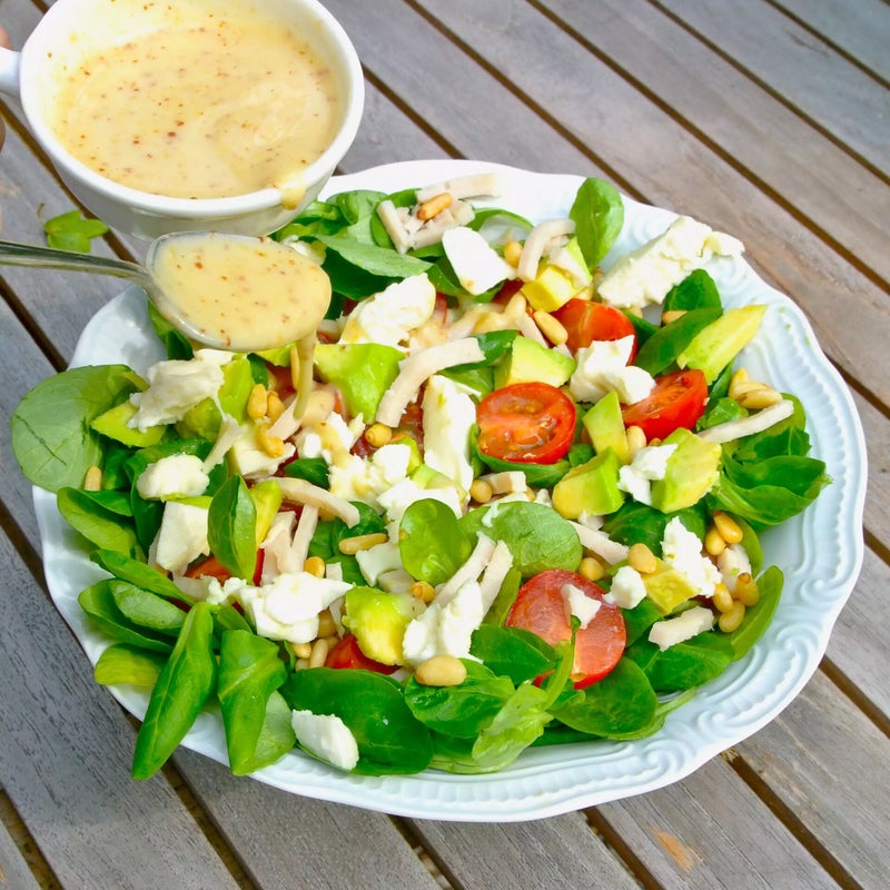 Salade met kip, avocado, hazelnoten, rucola en mozzarella
