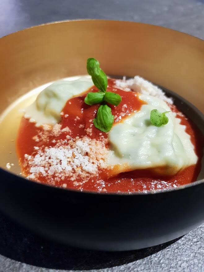- Maak verse pastavellen en rol ze uit tot de gewenste dikte, vorm de ravioli en sluit deze nauwkeurig, gebruik voldoende bloem om de ravioli niet aan het werkvlak te laten kleven.