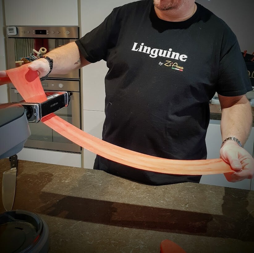 Maak een deeg van 300 gr. bloem, 2 eieren en 50 ml. rode bietensap en een snuifje zout.