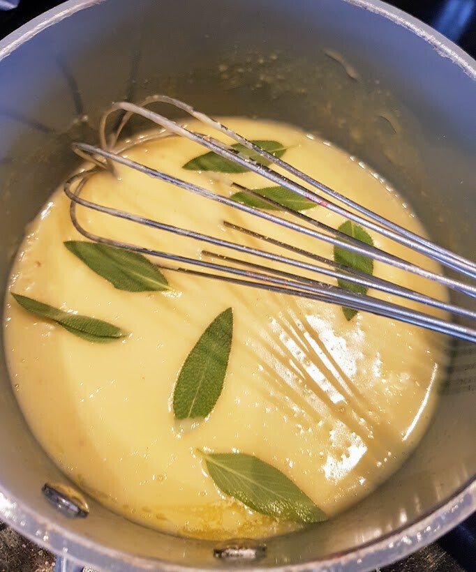 Haal de ravioli uit het kokend water, oversaus en werk af met salieblaadjes .