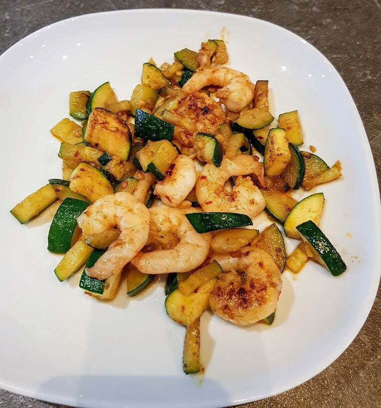 Pel de scampi en bak deze samen met de in blokjes gesneden courgettes aan in Zi'Anna's olijfolie samen met een teentje look.